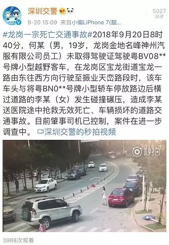 2018年9月20日8時40分,何某(男,19歲,龍崗金地名峰神州汽服有限公司員工)未取得駕駛證駕駛粵BV08**號牌小型越野客車,在龍崗區(qū)寶龍街道寶龍一路由東往西方向行駛至振業(yè)天巒路段時,該車車頭與將粵BN0**號牌小型轎車停放路邊后橫過道路的李某(女)發(fā)生碰撞碾壓,造成李某送醫(yī)院途中搶救無效死亡、車輛損壞的道路交通事故。目前肇事司機已控制,案件在進一步調(diào)查中。