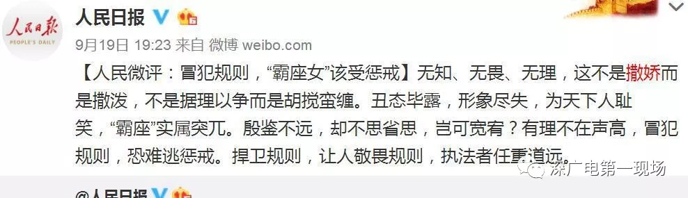 對此,@人民日報官方微博昨晚發(fā)表評論【冒犯規(guī)則,“霸座女”該受懲戒】:無知、無畏、無理,這不是撒嬌而是撒潑,不是據(jù)理以爭而是胡攪蠻纏。丑態(tài)畢露,形象盡失,為天下人恥笑,“霸座”實屬突兀。殷鑒不遠(yuǎn),卻不思省思,豈可寬宥?有理不在聲高,冒犯規(guī)則,恐難逃懲戒。捍衛(wèi)規(guī)則,讓人敬畏規(guī)則,執(zhí)法者任重道遠(yuǎn)。
