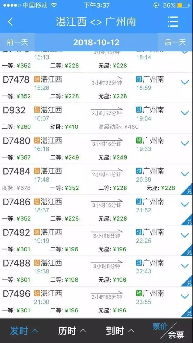 以10月19日廣州-珠海的票價來看,票價打折的車次發(fā)生了變化,D7601次的票價顯示為八折,其中二等座56元,比打折前便宜14元。原來打折的D7262車次恢復了原價。