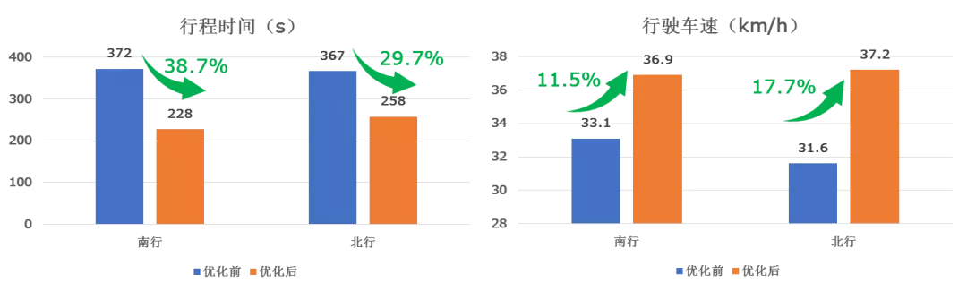 錦程路全長約4.4km,為進(jìn)一步提升路段行車舒適性,9月5日,深圳交警重新優(yōu)化錦程路(萬安-沙福)協(xié)調(diào)子區(qū),優(yōu)化后南往北平均行程時(shí)間由367s降至258s,降幅29.7%,平均行駛速度由31.6km/h提升到37.2km/h,提升17.7%;北往南平均行程時(shí)間由372s降至228s,降幅38.7%,平均行駛速度由33.1km/h提升到36.9km/h,提升11.5%。