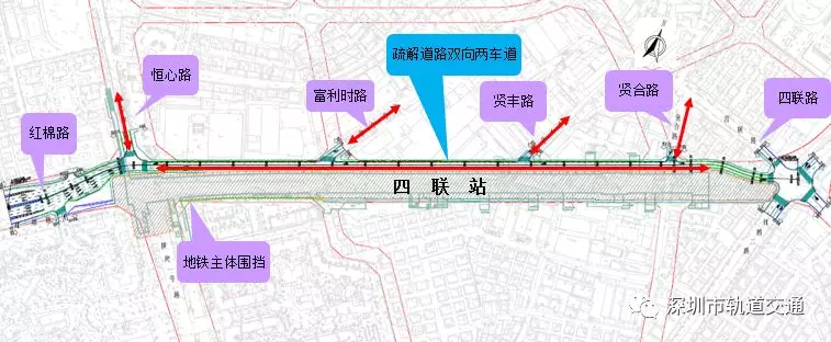 四聯(lián)站位于紅棉路與橫崗一號路、恒心路交叉口,沿紅棉路東西方向布置,為地下雙層島式車站(局部三層)。紅棉路為東西向主干道,規(guī)劃路寬50m,現(xiàn)狀路寬35m,雙向6車道,車流量較大。車站北側(cè)為新城匯商場,西北側(cè)為康樂幼兒園,西南側(cè)為信義錦繡花園,南側(cè)為康樂五區(qū)住宅小區(qū),人員相對密集。