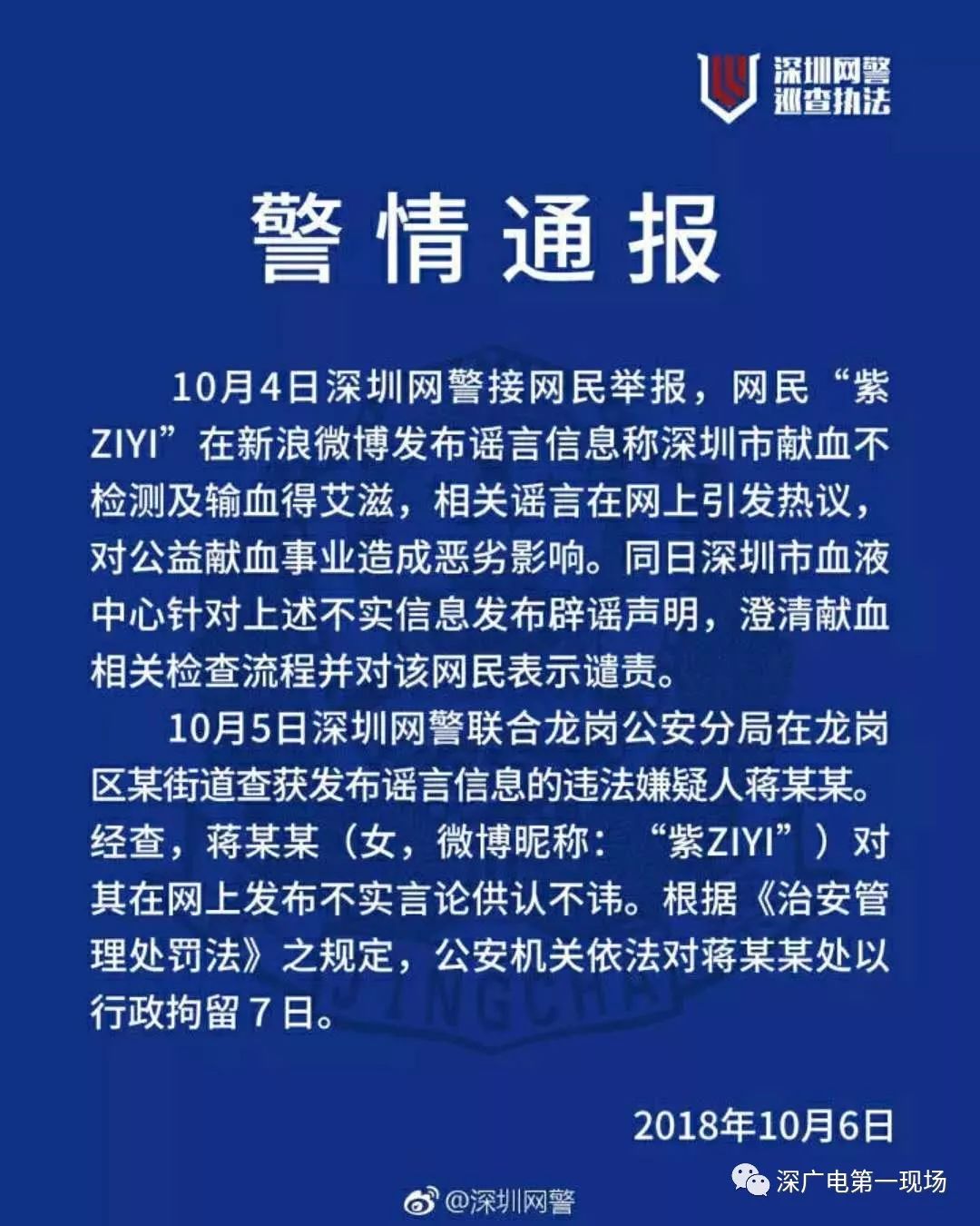 而瓦解謠言,最大程度減少謠言帶來的危害,除了職能部門及時以正視聽,更需執(zhí)法部門依法處理。對此,龍崗警方對蔣某某,處以行政拘留7天的處罰。希望這位蔣某某在這7天里好好反省,不再隨意散布謠言!