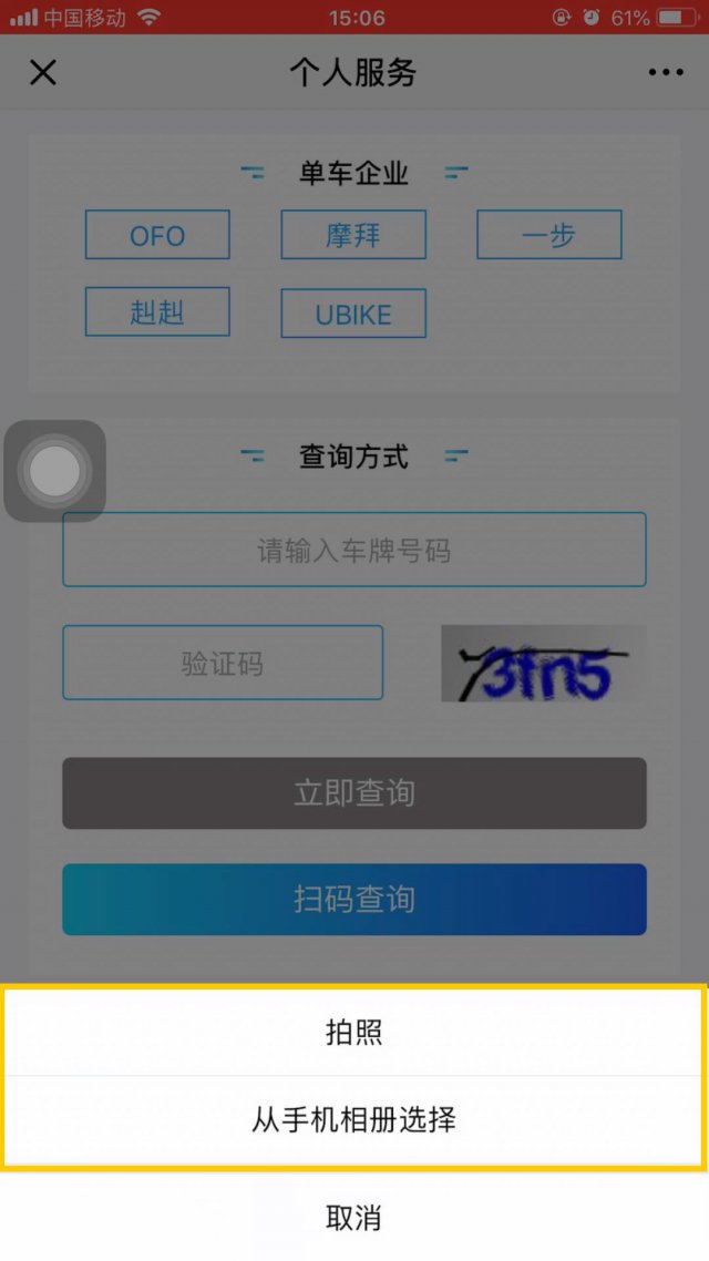 提交完手機(jī)號(hào)和驗(yàn)證碼之后,我們就來到了這個(gè)頁(yè)面,在這里,你可以選擇你要查詢的共享單車的品牌,品牌選擇完畢后,你可以選擇手動(dòng)輸入車牌號(hào)碼或掃碼查詢!