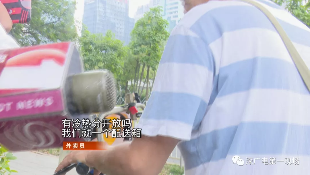 隨后送來的三份外賣里,冷飲和飯菜同樣是混合放在一個(gè)外賣箱中一起送過來。大部分外賣員反映,外賣箱沒有明確區(qū)分冷藏和熱藏區(qū)成了最大問題,對于商家統(tǒng)一打包的冷飲和熱飯菜,他們大多也都不會(huì)主動(dòng)去分開運(yùn)送。