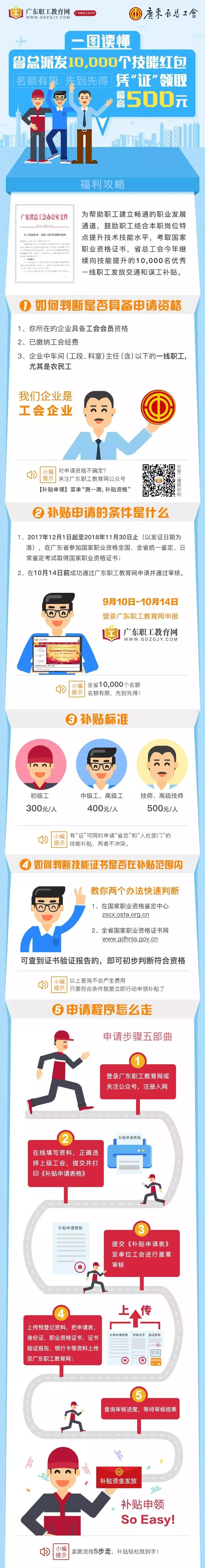 為提高我省產(chǎn)業(yè)工人隊伍素質(zhì),幫助更多產(chǎn)業(yè)工人提升技能水平,按照省總工會黨組會議通過的《廣東省總工會2018年產(chǎn)業(yè)工人大培訓(xùn)行動組織實施方案》,省總工會繼續(xù)向10000名技能提升的優(yōu)秀產(chǎn)業(yè)工人發(fā)放交通和誤工補貼。取得職業(yè)資格證書可獲300~500元補貼,名額有限,先到先得!