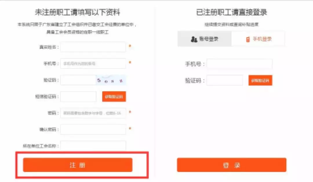 1.新注冊(cè)職工必須填寫完整信息--點(diǎn)擊提交資料--完成注冊(cè),系統(tǒng)自動(dòng)跳轉(zhuǎn)領(lǐng)取補(bǔ)貼頁(yè)面;