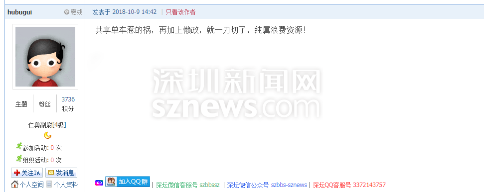 在深圳不斷推進(jìn)的城市建設(shè)進(jìn)程中,共享單車的禍,就不應(yīng)該由全體市民來“埋單”,更不應(yīng)該以犧牲市民的幸福感作為“除禍”的妙招。我們都期待,未來的深圳能用更合理、更人性化的措施,代替簡單粗暴的“一刀切”。