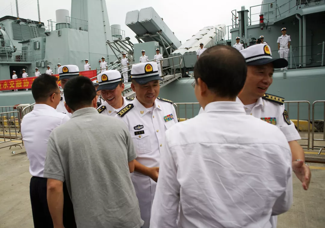 深圳市委副秘書長劉平生,市民政局局長廖遠飛,南山區(qū)委常委、宣傳部部長廖子彬,南山區(qū)委常委、人武部部長彭耀玖,副區(qū)長謝炳文等領(lǐng)導(dǎo)代表市、區(qū)雙擁辦在碼頭上歡送深圳艦。南部戰(zhàn)區(qū)海軍副參謀長李曉巖少將,深圳艦所在某驅(qū)逐艦支隊副政委蔣軍大校,深圳艦艦長黃北奇大校,深圳艦政委陳永強上校等與深圳親人一一握手道別。