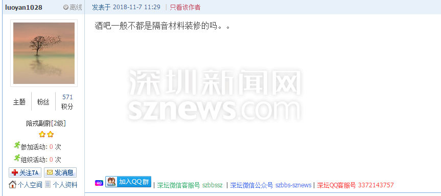 深圳新聞網(wǎng)11月7日訊(記者 施冰冰)11月6日,有網(wǎng)友在論壇爆料稱民治藍(lán)坤大廈米蘭國際酒吧每晚營業(yè)至凌晨4點,音樂聲震耳欲聾,嚴(yán)重影響了附近居民的睡眠,“逼得”該網(wǎng)友只能搬家。(網(wǎng)帖地址:https://szbbs.sznews.com/thread-3815241-1-1.html)