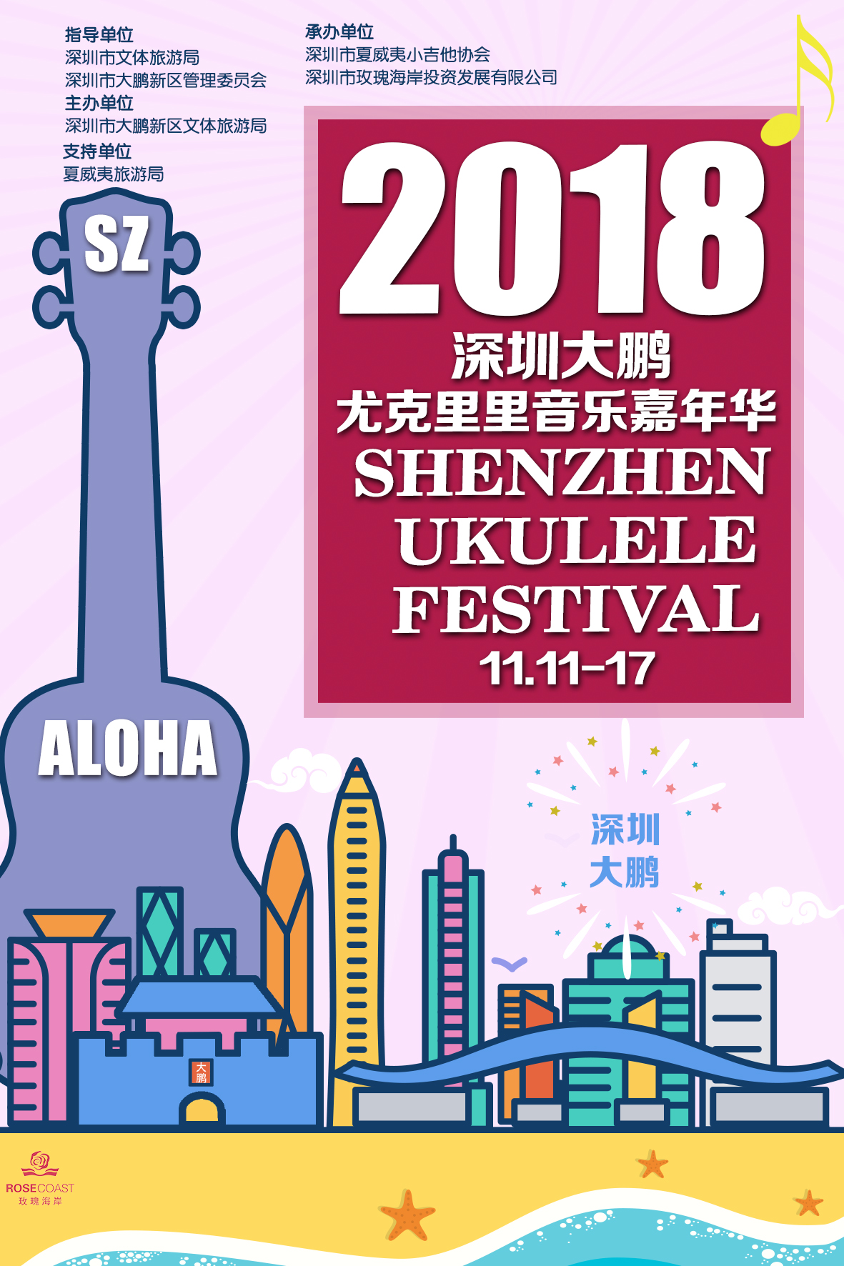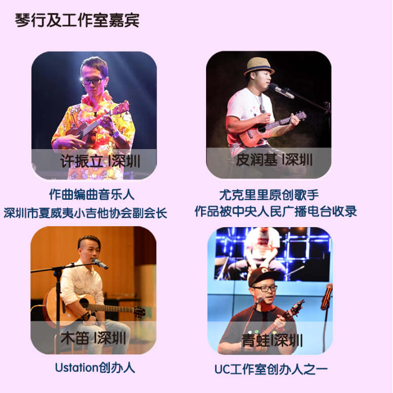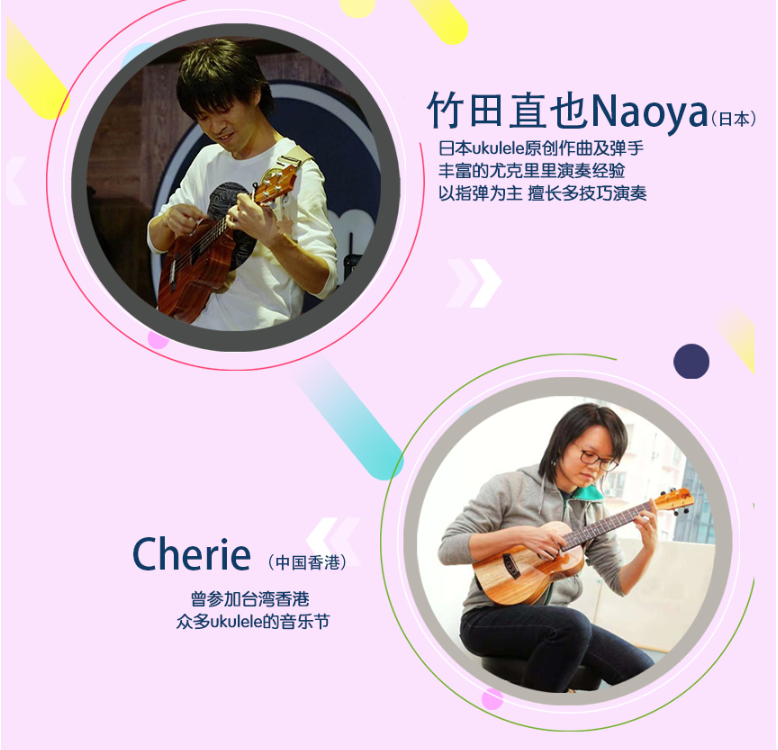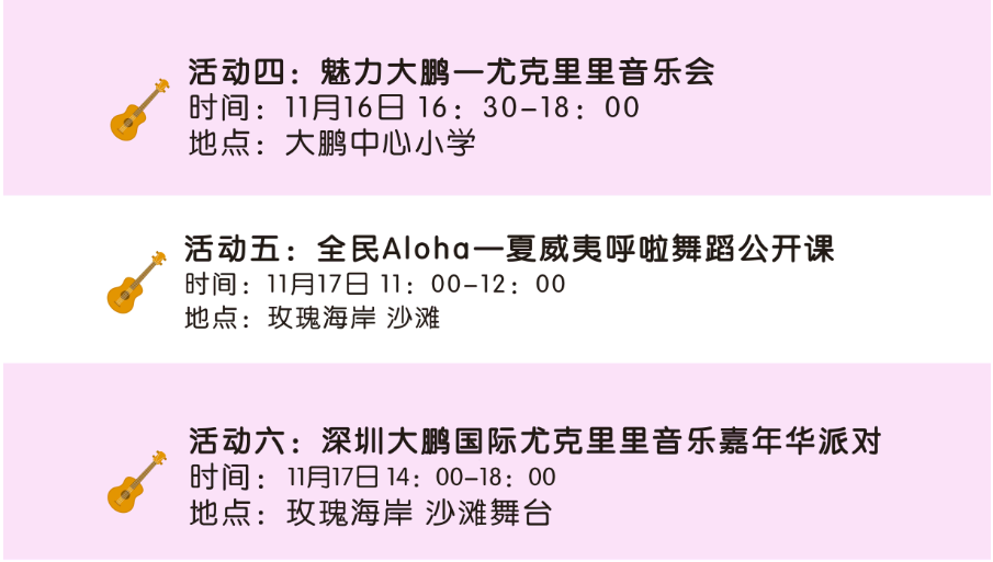 其中全民參與嘉年華音樂會11月17日的將會在深圳市玫瑰海岸沙灘舉辦,有深圳、香港(中國)、臺灣(中國)、美國、日本、廣州、中山、珠海等地的嘉賓和愛好者近50組表演者帶來4小時尤克里里盛會,表演者年齡跨度更是從5歲到60歲。嘉年華現(xiàn)場除了尤克里里音樂會,還將有Moana夏威夷呼拉舞風(fēng)情體驗,中國臺灣尤克里里協(xié)會會長陳建廷新書《兒童尤克里里英文暢游》深圳首發(fā),中國臺灣尤克里里世界大賽冠軍蔡皓怡原創(chuàng)專輯《航海日志》深圳首發(fā),以及美國尤克里里音樂家、藝術(shù)家新專輯《粉色海豚》尤克里里專輯中國大陸首發(fā)。