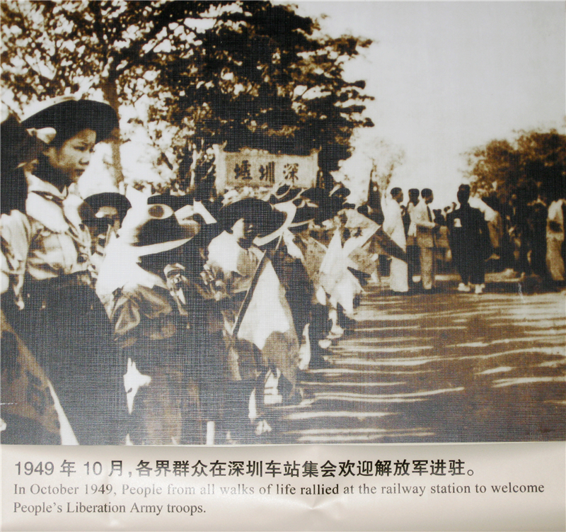 圖為居民在車(chē)站歡迎解放軍,背后可清晰地看到當(dāng)時(shí)深圳火車(chē)站的站名“深圳墟”