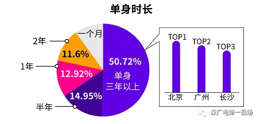針對(duì)單身時(shí)長(zhǎng)的調(diào)查發(fā)現(xiàn),有高達(dá)50.72%的人為單身三年以上的“長(zhǎng)單族”,“長(zhǎng)單族”占比最多的城市前三為北京、廣州和長(zhǎng)沙。