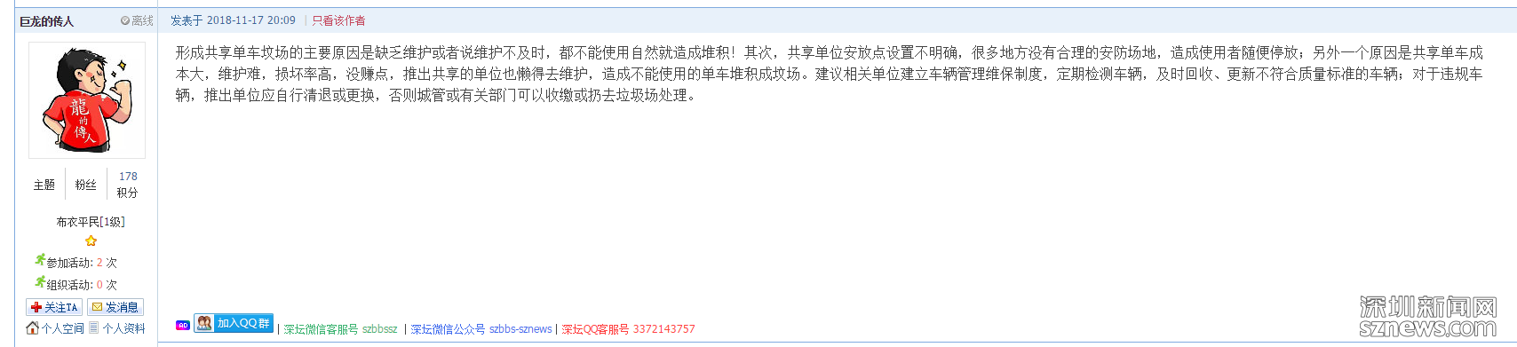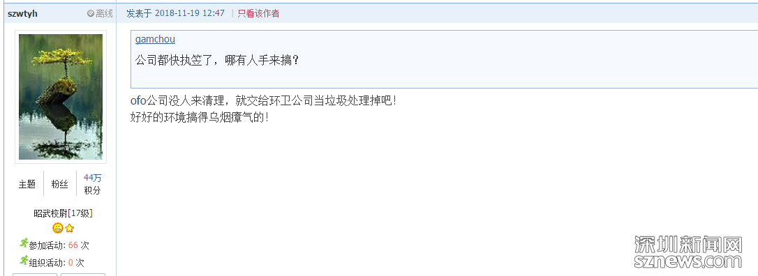 “福田河的水質(zhì)很好,但大量的故障單車(chē)停放在路邊實(shí)在是煞風(fēng)景?!本W(wǎng)友“szwtyh”認(rèn)為,不應(yīng)該讓這些單車(chē)礙了深圳的城市景觀,掃了市民欣賞福田河水的興致。