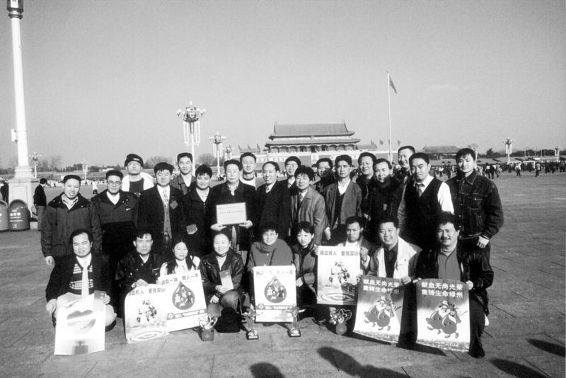1999年,27位深圳市民獲得全國首批無償獻(xiàn)血金質(zhì)獎杯后在天安門前合影。余海蓉 攝