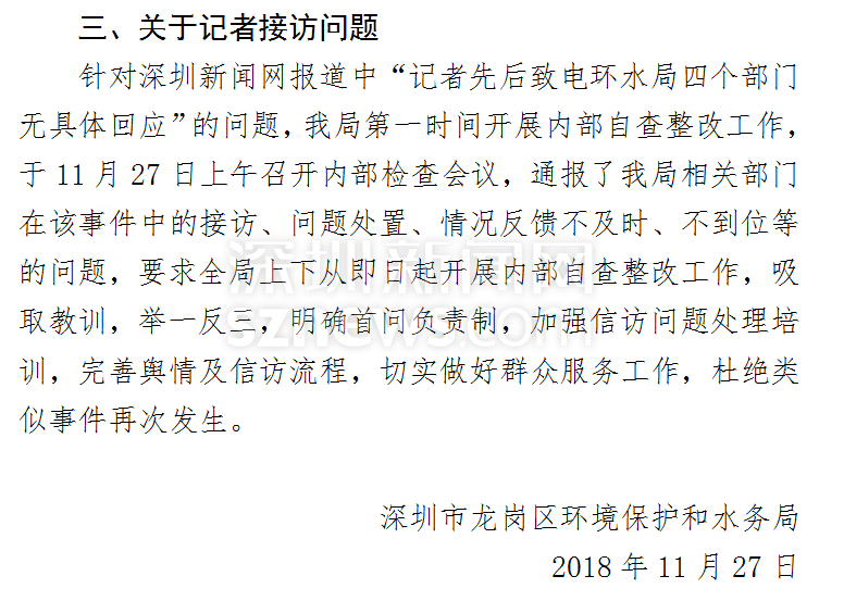 此外,對于前期報道中記者所提及的“先后致電四個部門均無具體回復”的情況,龍崗區(qū)環(huán)水局也給予了回應(yīng)。他們表示將在日后的工作中完善輿情和信訪流程,切實做好群眾服務(wù)工作。