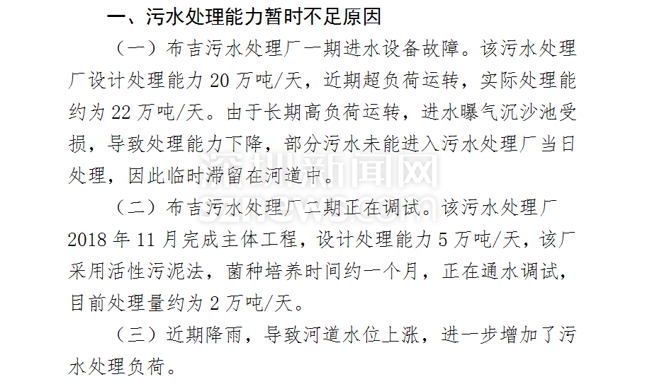 在其復(fù)函中,明確說明了河道黑臭的原因主要為該片區(qū)污水處理能力暫時(shí)不足(片區(qū)污水產(chǎn)生量約為26萬噸/天,目前實(shí)際污水處理量約為24萬噸/天),為防止生活污水直排下游,臨時(shí)設(shè)置橡膠壩,生活污水臨時(shí)滯留河道所致。