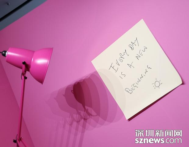 Anglepoise是英國經(jīng)典的臺燈設計,Paul Smith先生以他的英式幽默,將它依比例放大成巨型臺燈,并涂上了展覽主色系的粉紅色,背景再加上 Paul Smith先生最喜愛的便利貼 EVERY DAY IS A NEW BEGINNING,在展覽出口作為對每位觀眾最后的謝禮。