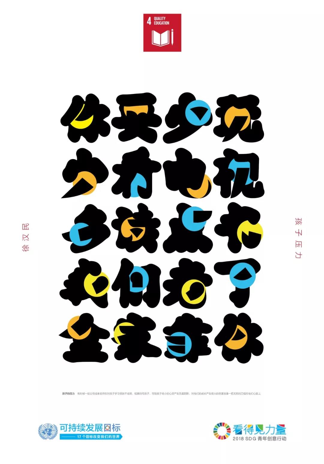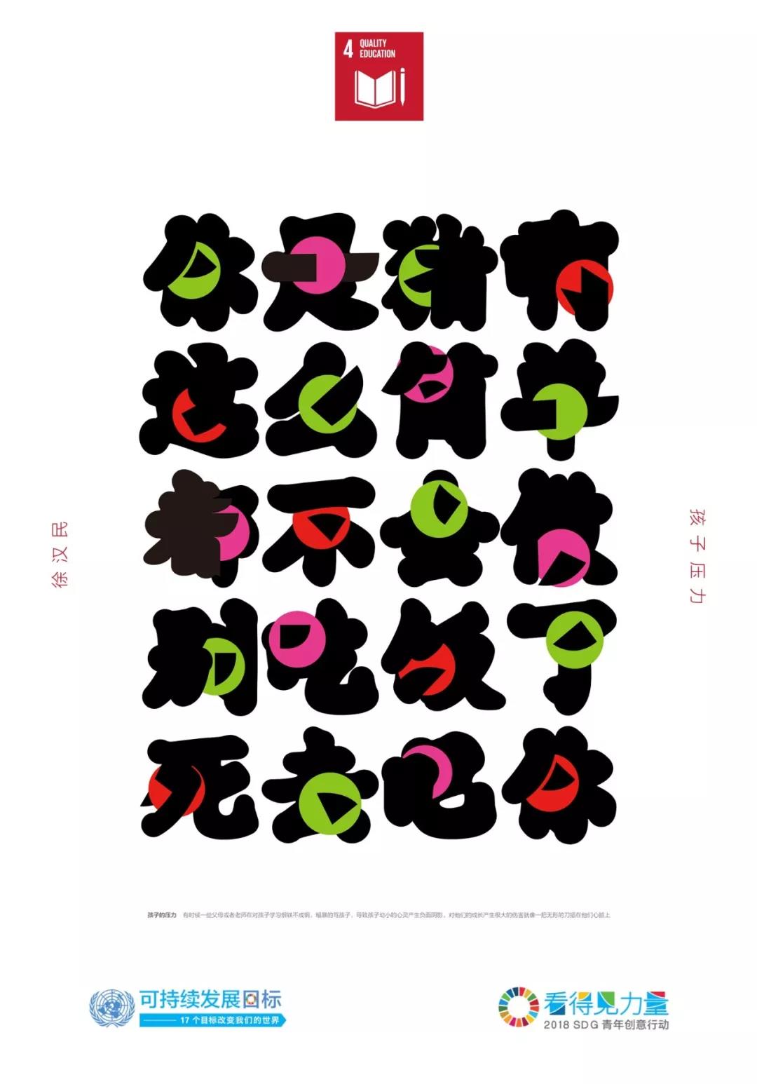 作品解釋 /現(xiàn)在孩子的壓力越來越大,導(dǎo)致很多孩子心理灰暗、暴力犯罪、自我封閉等現(xiàn)象,其中一個(gè)原因是父母期望和恨鐵不成鋼打罵給孩子帶來沉重的壓力。由此作者直接用那些語句來設(shè)計(jì),這些字體中穿插著一個(gè)小圓點(diǎn)即孩子們的腦袋,他們被這些語言帶來的無形壓力刺痛,整個(gè)字比較圓潤只有關(guān)鍵的地方鋒利無比,就像一把無形的刀插在他們心上。