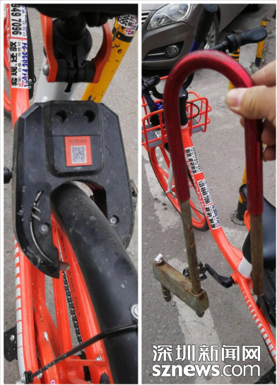 被人為破壞的共享單車車鎖及車上的“私鎖”