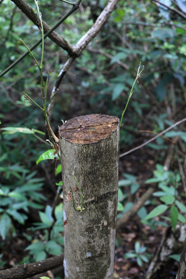 12月24日上午,記者再次來到首次發(fā)現(xiàn)盜采土沉香的地點。經(jīng)過近兩個小時的搜尋,在東北側(cè)山坡和溪谷中,又接連發(fā)現(xiàn)了6棵被盜伐的疑似野生土沉香。記者隨即將情況向仙湖植物園管理處副主任、植物專家張壽洲博士通報了情況,張博士告訴記者,管理處會盡快勘查現(xiàn)場,對被破壞的土沉香進行處理。"通常情況下,被鋸斷的土沉香不會死亡,我們會根據(jù)實際情況對受損的植株采取相應(yīng)的保護措施。另外,我們會用水泥、油漆對土沉香被盜采盜伐的斷面進行封閉處理,讓不法分子盜采不到香料。"張博士說。