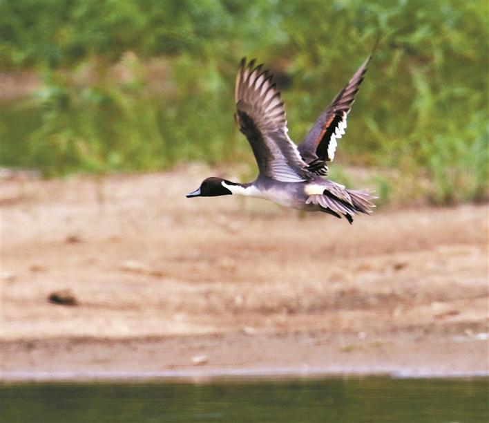 一只針尾鴨飛過(guò)3號(hào)魚塘上空。