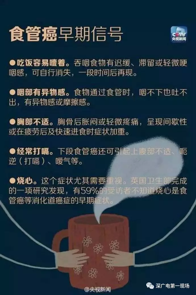 這個溫度既不會過度刺激食道、腸胃,也不容易造成血管收縮。所以,在進食的時候,建議把溫度過高的食物、熱飲先放置一段時間。當然了,食管癌也并不是不治之癥,關鍵在于早發(fā)現(xiàn)早治療。