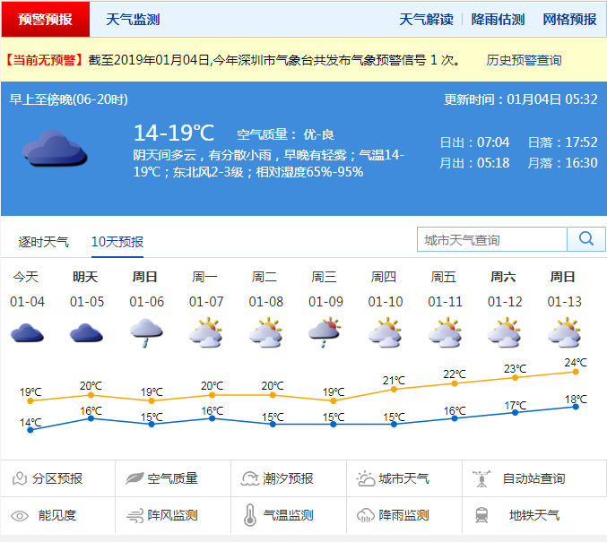 深圳市氣象局預(yù)計(jì),今日氣溫14-18℃;5日下午到9日受弱冷空氣影響,氣溫小幅波動(dòng),早晚有輕霧,間中有小雨,部分時(shí)間可見陽光。