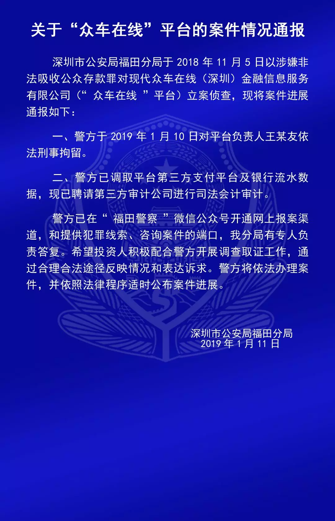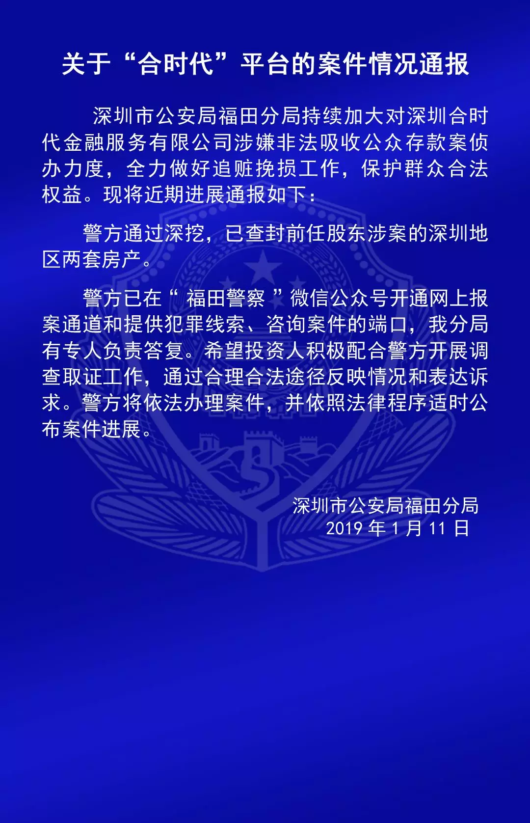 福田公安通報(bào)六家平臺(tái)涉嫌非法吸收公眾存款案的情況
