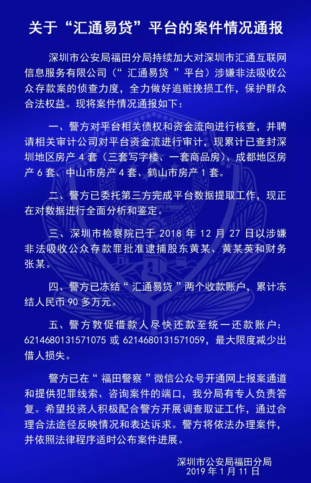 福田公安通報六家平臺涉嫌非法吸收公眾存款案的情況