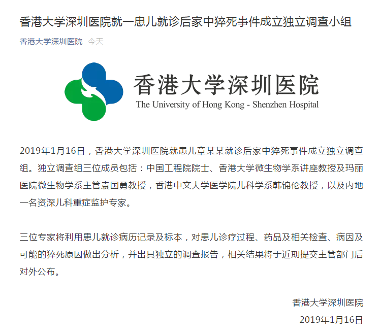 1月16日,香港大學(xué)深圳醫(yī)院就患兒章某某就診后家中猝死事件成立獨(dú)立調(diào)查組,待調(diào)查完畢后將把相關(guān)結(jié)果提交主管部門并對(duì)外公布。