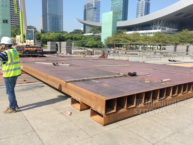 在市民中心南廣場(chǎng)搭建春晚深圳分會(huì)場(chǎng)舞臺(tái),借助深圳燈光秀為背景,確實(shí)是一個(gè)絕佳的創(chuàng)意。要實(shí)現(xiàn)創(chuàng)意,搭建舞臺(tái)是關(guān)鍵一役。去過南廣場(chǎng)看燈光秀的深圳人應(yīng)該知道,南廣場(chǎng)中間位置正好是地下車庫(kù)的玻璃采光棚,春晚主舞臺(tái)剛好就位于廣場(chǎng)玻璃采光棚的正上方。玻璃材質(zhì)決定了它無法承受上部集中荷載,需要事先改變傳力路徑或?qū)?chǎng)地下部梁板進(jìn)行加固處理,謝衛(wèi)兵和同事發(fā)現(xiàn),研究舞臺(tái)局部可操作性的加固方案迫在眉睫。