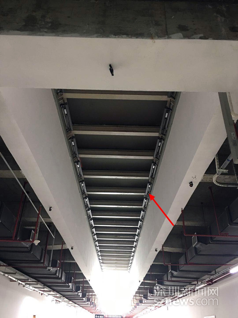 激光位移計(jì)安裝在地下車庫的頂端(紅色箭頭處),記錄位移數(shù)據(jù)(王啟文供圖)