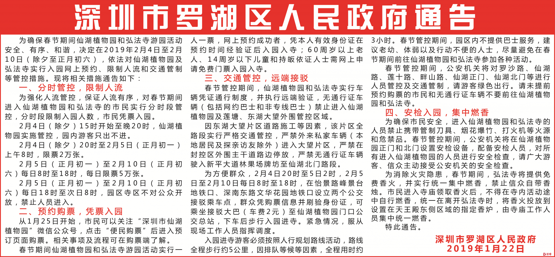 深圳特區(qū)報(bào)2019年01月22日訊 春節(jié)臨近,許多市民對(duì)今年春節(jié)期間仙湖植物園和弘法寺游園活動(dòng)的相關(guān)安排非常關(guān)心。1月22日,羅湖區(qū)政府就此發(fā)布了正式通告。