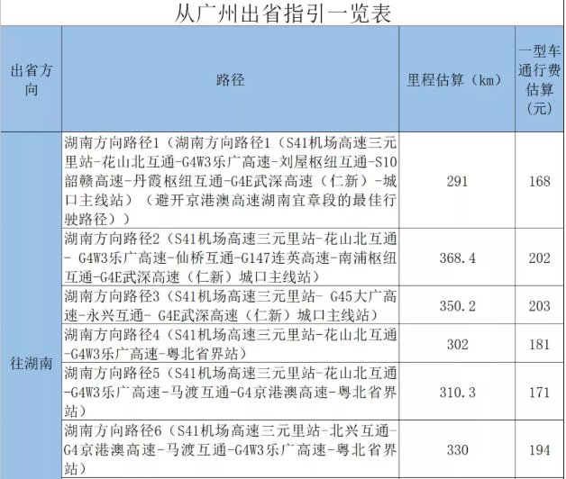 從廣州出發(fā),通往湖南、廣西東北部、江西、福建、廣西北部灣及海南方向的出行指引: