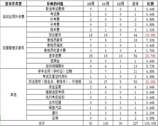 第四季度投訴主要集中在退學(xué)退費(fèi)、非法駕校(報名點、教練車)、外地班等問題。學(xué)員與不合規(guī)范的駕校、外地班產(chǎn)生的矛盾是本季度產(chǎn)生投訴的主要原因;此外,還有部分學(xué)員反映綜合服務(wù)等問題。