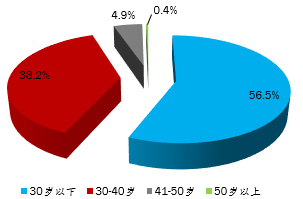 年齡方面,學(xué)員平均年齡為29歲,其中30歲以下的有24804人,占比56.5%;30-40歲的有16785人,占比38.2%;41-50歲的有2156人,占比4.9%,50歲以上的有157人,占比0.4%。