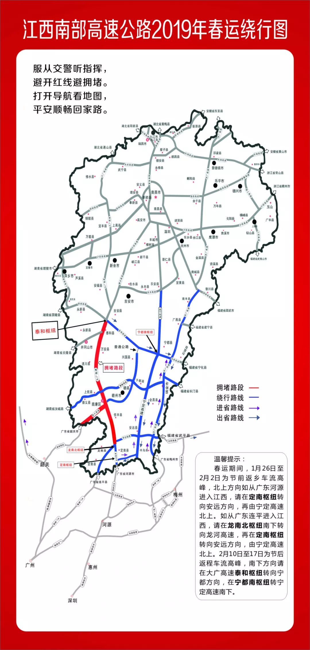 春運(yùn)高峰時段,樂廣高速花山互通立交段有一定概率產(chǎn)生擁堵,建議旅客根據(jù)實(shí)時路況選擇武深高速或京珠高速繞行。