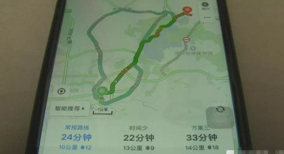 導(dǎo)航路線顯示,乘客所堅持的走法是常規(guī)路線,司機的走法距離更長,但用時較短。