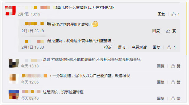 還有一些網(wǎng)友借機(jī)表達(dá)了自己對(duì)某類人的"墻裂"不滿?。]事兒拉什么球框啊,以為在打 NBA?。ⅲ⒒钤摚蚯蚓蜔┎荒芸圻€裝 X的"......