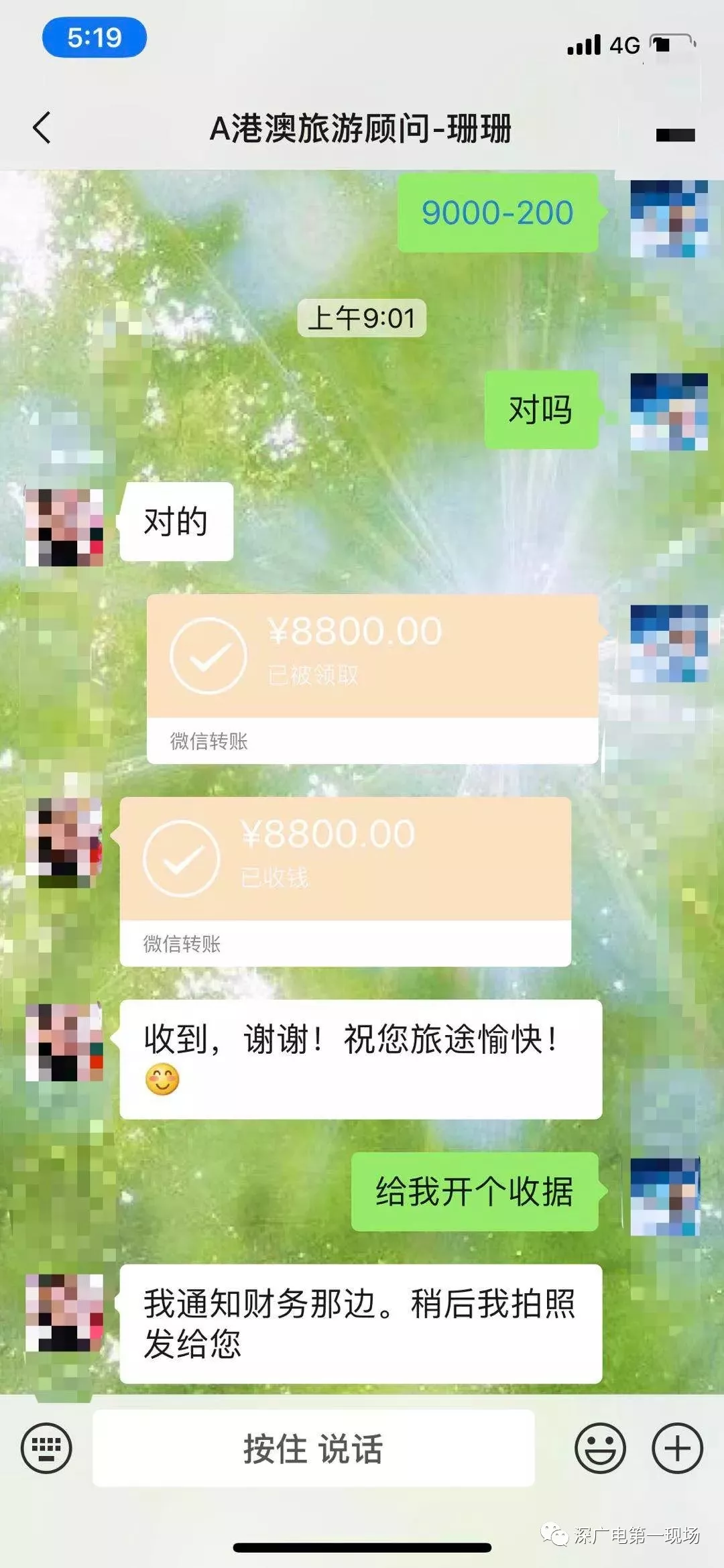 8號(hào)上午,記者先后用電話、微信等方式聯(lián)系上了,剛躲進(jìn)香港海港城馬哥孛羅酒店的李女士。她說,1月31日通過百度搜索“港澳游”,與深圳北方大廈7樓的國(guó)旅,微信名叫“珊珊”的旅游顧問聯(lián)系,在支付了200元定金后,于2月6日,從北京飛抵深圳入住了“珊珊”安排的鵬威酒店,并與“珊珊”的同事簽訂了合同。李女士夫婦和他們的孩子以及父母5人,以平均1800元的團(tuán)費(fèi)價(jià)格,參加25-30人的5天4晚精品豪華團(tuán),赴香港澳門游玩,精品團(tuán)豪華的內(nèi)容是無購(gòu)物、住“四星”的香港君逸酒店。2月7日上午,他們就從口岸過關(guān)到了香港。