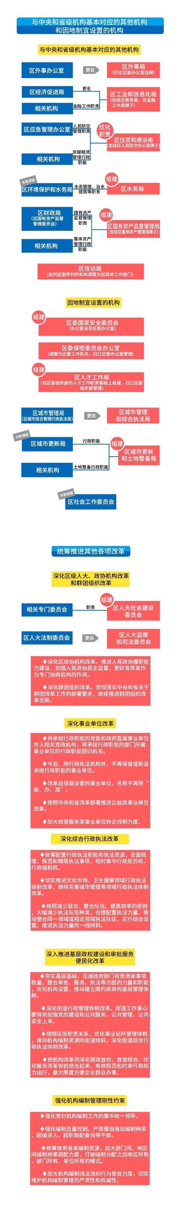 本次區(qū)級機構改革,總的要求是中央及省明確的改革任務要堅決落實到位,主要機構設置同省、市保持基本對應。同時,又充分體現(xiàn)地方機構綜合設置的特色,以推進黨政機構職能優(yōu)化協(xié)同高效為著力點,改革機構設置,優(yōu)化職能配置,深化轉職能、轉方式、轉作風,提高效率效能,積極構建系統(tǒng)完備、科學規(guī)范、運行高效的機構職能體系,構建簡約高效的基層管理體制。