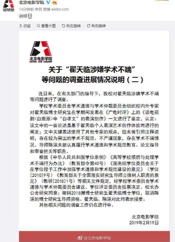 繼翟天臨退出北大博士后站之后,北電也于19號(hào)撤銷(xiāo)其博士學(xué)位了