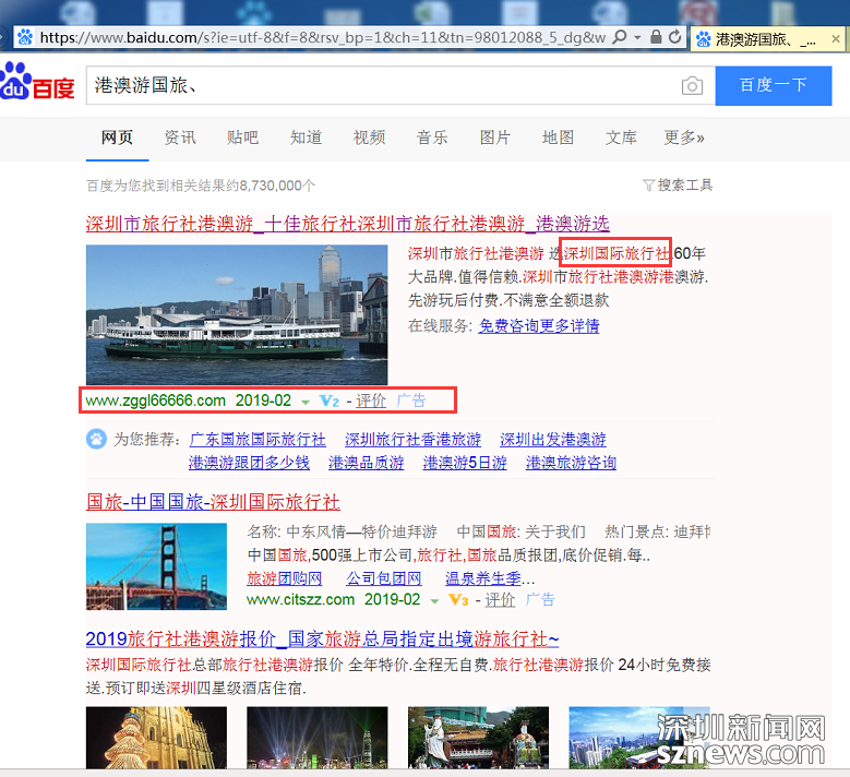 深圳市消委會(huì)模擬消費(fèi)者網(wǎng)絡(luò)搜索實(shí)際使用場(chǎng)景,在百度搜索中搜索“港澳游國(guó)旅”等關(guān)鍵詞,進(jìn)行了專項(xiàng)測(cè)試調(diào)查。調(diào)查發(fā)現(xiàn),搜素“港澳游國(guó)旅”等關(guān)鍵詞時(shí)搜索頁(yè)面會(huì)出現(xiàn)加V等級(jí)認(rèn)證的旅行社廣告信息,但經(jīng)核實(shí),“深圳信用網(wǎng)”商事主體登記信息中并無(wú)該企業(yè)。