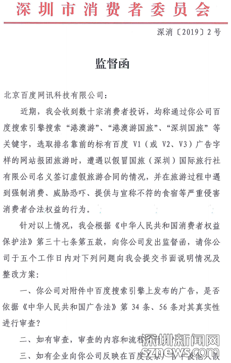 2月26日上午,深圳市消費(fèi)者委員會(huì)(以下簡(jiǎn)稱“深圳市消委會(huì)”)就春節(jié)期間,不少外地消費(fèi)者通過(guò)百度搜索廣告報(bào)名港澳游“野馬”旅行社上當(dāng)被騙的問(wèn)題,召開港澳游“野馬”旅行社投訴調(diào)查情況通報(bào)會(huì),通報(bào)投訴調(diào)查進(jìn)展情況。