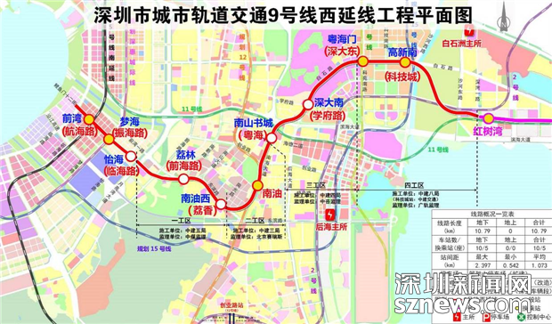 據(jù)了解,地鐵9號線西延線東起紅樹灣南站,經(jīng)深圳灣至前海灣,終點為前灣站,與5號線南延線換乘。線路全長約10.8千米,設(shè)車站10座,全線采用地下敷設(shè)方式。