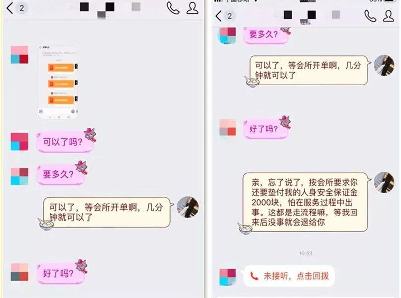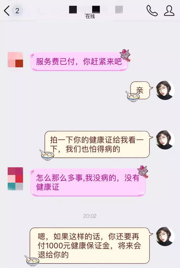 轉(zhuǎn)賬后,小李同學(xué)到一酒店開好房間,靜等“小妹”上門,但此時(shí),對方要求再交1000元“風(fēng)險(xiǎn)押金”才能安排“小妹”過來。