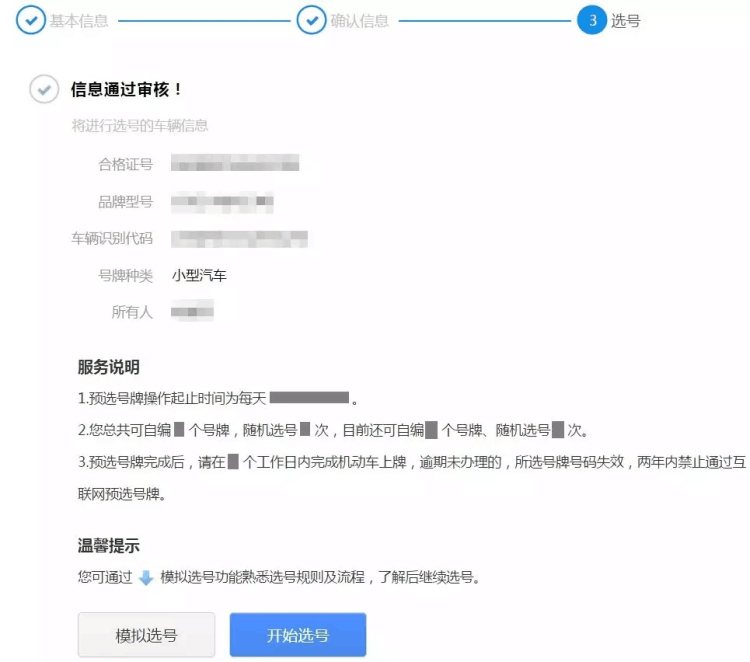 系統(tǒng)核查通過后會進(jìn)入選號服務(wù)說明,用戶可以看到之前提交的信息,閱讀服務(wù)說明后,點擊"開始選號"按鈕開始進(jìn)行選號操作。