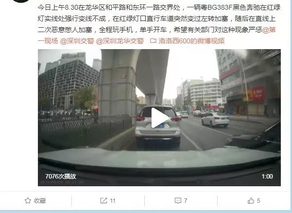 深廣電直播深圳2019年3月13日訊 近日,深圳交警收到一則微博舉報(bào),在龍華區(qū)和平路和東環(huán)一路交匯處,一輛黑色奔馳小車(chē)在等待紅綠燈時(shí)強(qiáng)行變線未果后在直行車(chē)道突然變道左轉(zhuǎn)加塞,險(xiǎn)些與后方車(chē)輛發(fā)生擦碰事故。舉報(bào)人表示,當(dāng)時(shí)黑色奔馳小車(chē)司機(jī)在駕駛車(chē)輛時(shí)不僅單手開(kāi)車(chē),更是全程玩手機(jī)。
