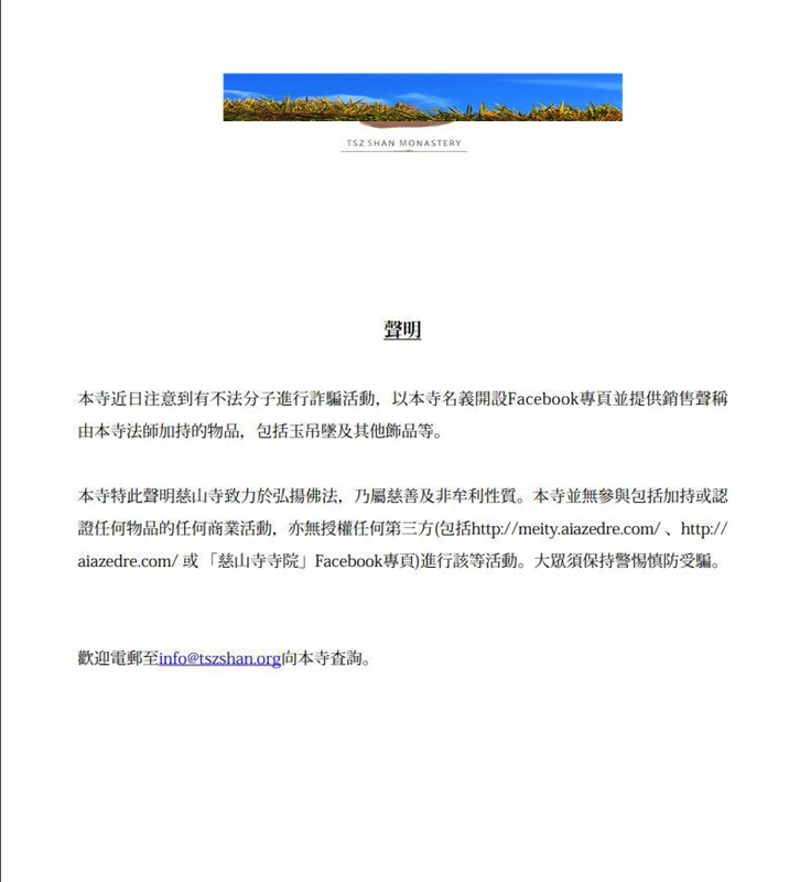 警方同時(shí)向深晚提供的證據(jù)中,還有一份香港某知名寺院的聲明。聲明中說:"本寺近日注意到有不法分子進(jìn)行詐騙活動(dòng),以本寺名義開設(shè) Facebook專頁(yè)并提供銷售聲稱由本寺法師加持的物品,包括玉吊墜及其他物品等。本寺特此聲明,本寺并無參與加持或認(rèn)證任何物品的任何商業(yè)活動(dòng),亦無授權(quán)任何第三方進(jìn)行該等活動(dòng)。大眾須保持警惕慎防受騙。"