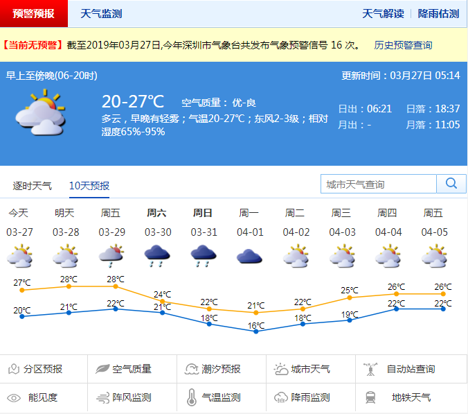 深圳新聞網(wǎng)2019年3月27日訊 深圳今日多云,早晚有輕霧;氣溫20-27℃,相對濕度65%-95%;東北風2-3級。預計28日多云間晴,氣溫繼續(xù)回升,早晚有輕霧或霧;29日多云轉雷陣雨;30-31日冷空氣影響,我市陰天有陣雨或雷陣雨,日溫差小,天氣明顯轉涼;4月1日陰天轉多云,偶有零星小雨。